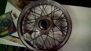 Here are a couple of views of the Tavener jig,and the wheel which is now apart ,the hub is away and the rim is cleaned. I shall be obtaining some stainless spokes