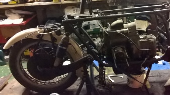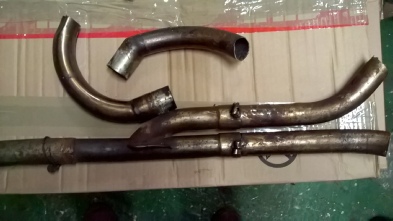 Now the real fun began. The ugly siamese exhaust pipes, obviously intended for sidecar configuration snaked across and under the front of the engine and met behind the RH footrest, sandwiched between engine and frame,and there had rusted in contentment. There was no movement in the entire assembly and the pipes would not budge in the heads. I tried copious floods of easing fluid and repeated heating, trying to move the pipes, to no avail. In the end in desperation I took the disc cutter (again!) and cut the pipes into two stubs then I could finally rotate them slightly which allowed the penetrating fluid to finally penetrate and after some protracted wrestling they came out followed by the remnants of the lower pipes. My original vague intention to replace the exhaust system with a standard twin R75 exhaust system seemed to have become a definite one.