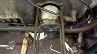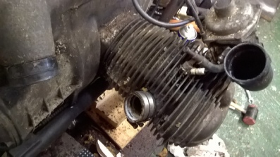 Leaving the swing arm assembly aside I drove towards my goal of removing the engine and gearbox, and so the exhaust pipe nuts then became the next problem, however it would seem that even the most mollycoddled air head twins can suffer from seizures of these items so after a quick session with c spanner, anti seize spray, and my propane torch followed by a look at the cost of new nuts, I resolved to do what one of the manuals suggested and cut them off , some delicate work with the disc cutter (That seems to have become the weapon of choice in this disassembly!) and some sharp blows with a chisel and the nuts split and wound off easily. The cylinder head threads looked pretty poor so it was obvious this was a much visited battleground and I had made a good call.